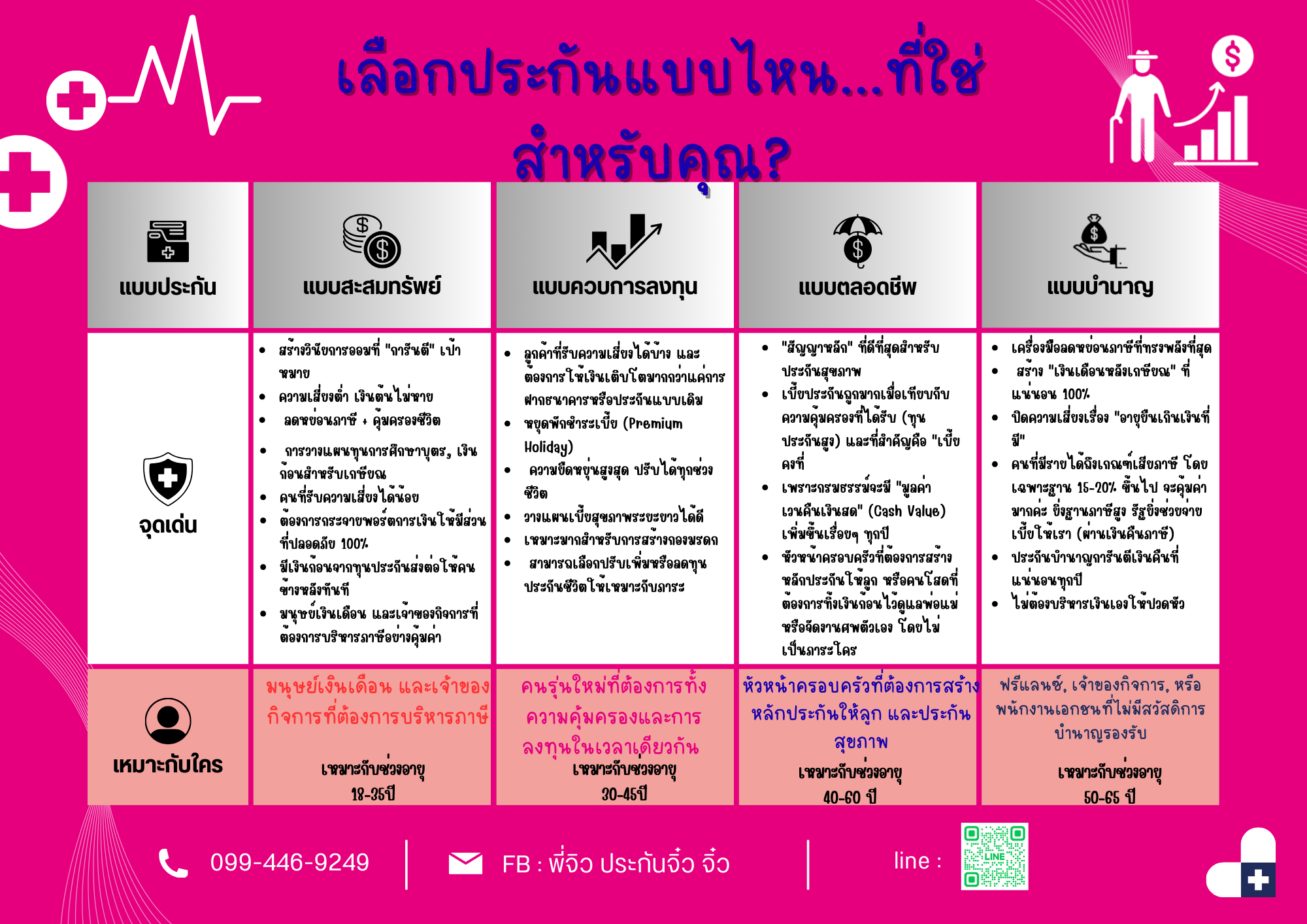 เหมาะกับใคร: หัวหน้าครอบครัวที่เป็นเสาหลักหารายได้, คนที่ต้องการสร้างกองมรดกให้ลูกหลาน, หรือคนที่ต้องการซื้อ "ประกันสุขภาพ" แนบท้ายระยะยาว