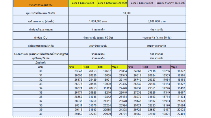 ถ้าคุณมีประกันกลุ่มหรือประกันสังคมอยู่แล้ว แนะนำให้เลือก แผน 5 ล้านบาท แบบมีค่ารับผิดส่วนแรก (Deductible) 30,000 บาท ครับ เพราะเบี้ยจะประหยัดขึ้นเกือบครึ่ง! แต่ได้ความคุ้มครองสูงถึง 5 ล้านบาท เอาไว้ปิดความเสี่ยงโรคใหญ่ๆ ได้สบายค่ะ