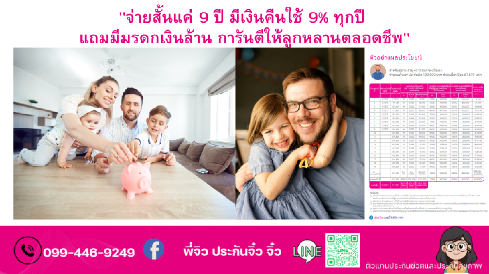 "จ่ายสั้นแค่ 9 ปี มีเงินคืนใช้ 9% ทุกปี แถมมีมรดกเงินล้าน การันตีให้ลูกหลานตลอดชีพ"