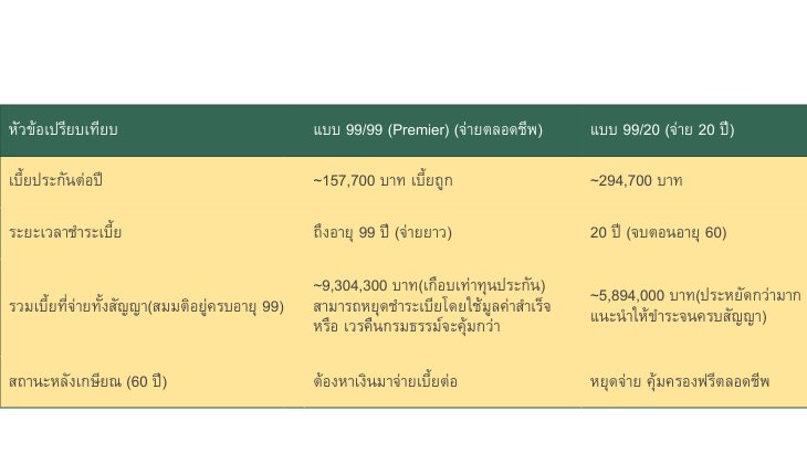 เหตุผล: หากอายุยืนถึง 99 ปี แบบ 99/20 จะจ่ายเบี้ยรวมน้อยกว่า